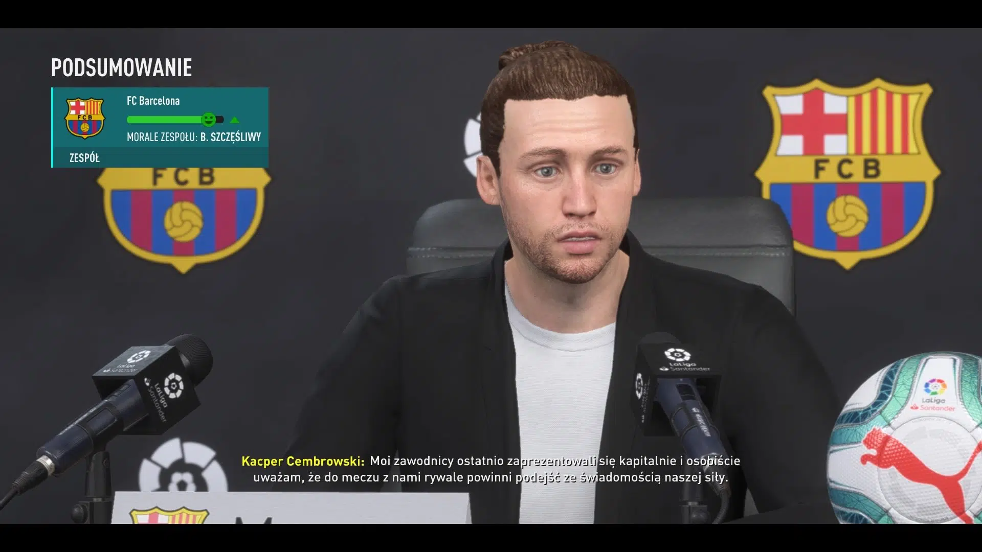 Największą zmianą są już okropnie długo wyczekiwane rozbudowane konferencje, o których wspominałem nawet w recenzji Fify 19. Wszyscy gracze na to czekali już od dłuższego czasu – dzięki temu ta kariera ma w sobie głębię i nie jest to już jedynie granie meczów od jednego okienka transferowego do drugiego. Konferencje przedmeczowe są tylko przed ważniejszymi spotkaniami, zaś wywiady pomeczowe są zawsze. Nasze wypowiedzi wpływają na morale poszczególnych piłkarzy oraz całego zespołu, co następnie przekłada się na formę i statystki zawodników. Dla przykładu – prowadzimy FC Barcelonę, w drugim sezonie stwierdzamy, że Luis Suarez najlepsze czasy ma już za sobą i pora, aby zszedł ze sceny. Dostaje więc niewiele szans gry, a za niego wskakuje młody napastnik, który wyśmienicie rokuje. Urugwajczyk może zwrócić się do nas ze swoim niezadowoleniem lub pokorną prośbą o większą liczbę minut na boisku. Zależnie od naszej odpowiedzi, możemy go podbudować, lub, całkiem odwrotnie, zrobić wyrzuty że w ogóle śmiał się do nas w tej sprawie zwrócić i wtedy jego morale spadną jeszcze bardziej. Taka sytuacja oczywiście powoduje sporo szumu medialnego, więc co konferencję dostaniemy pytanie, dlaczego Luis nie wychodzi w podstawowej XI, czy zagra w następnym meczu lub czy mamy zamiar pozbyć się napastnika, który zrobił tak wiele dla zespołu. Taka sytuacja nie wpływa dobrze na zawodnika, który zaliczy tymczasowy, dosyć spory regres w najważniejszych statystykach i może mieć nawet -7 punktów do strzelania przez niejasną sytuację w klubie.