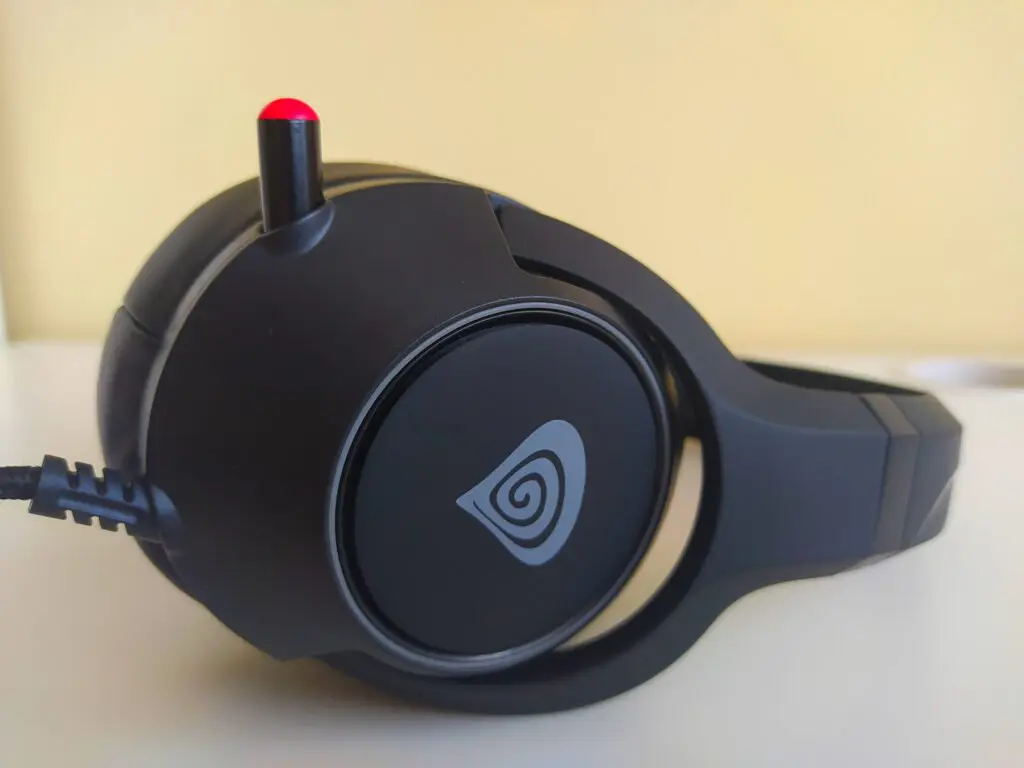 Zewnętrzna konstrukcja owalnych muszli jest już wykonana ze zdecydowanie lepszej jakości, twardego plastiku. Na środku ozdobione są lekko gumowaną wstawką z szarym logo Genesis. Lekko gumowany jest także plastikowy element łączący pałąk z nausznikami. Szkoda, że tej samej metody wykończenia nie zdecydowano się zastosować na pałąku.