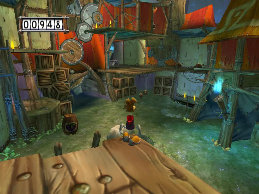 Pierwszym z nich jest jazda na bucie, polegająca na podążaniu za drugim butem i uderzaniu go. W praktyce wygląda to tak, że Rayman zmniejsza się do rozmiarów prawie że ziarenka ryżu, ląduje w jednym bucie, ściga drugi i go atakuje do wyczerpania sił. Po ostatecznym skopaniu wraca do normalnej postaci i zdobywa jedną z wcześniej znanych puszek, by móc iść dalej. Kolejnym wyzwaniem, które dobrze pamiętam jest pokonanie Mrokluma z tarczą. Przyznam, że był to jeden z najtrudniejszych etapów w całej grze. By go pokonać, trzeba było skakać i jednocześnie celować w bok. Tutaj trzeba było po prostu pomyśleć, jak celnie trafić w przeciwnika, unikając drewnianej osłony.