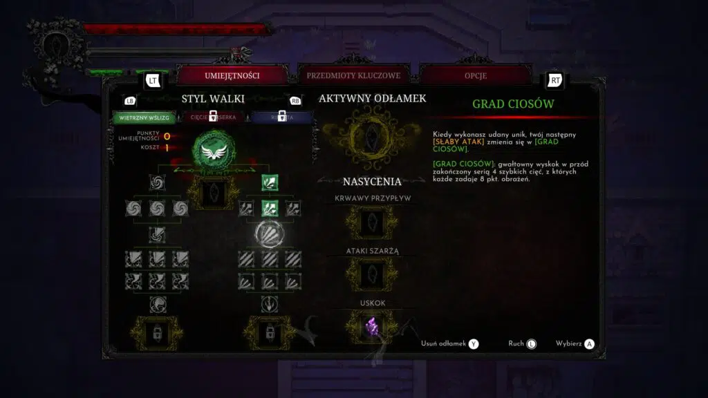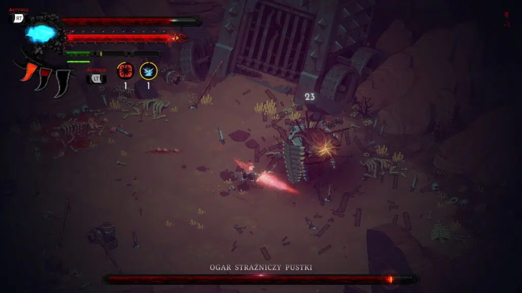 Wspominałem już, że przeciwników nie ma zbyt wielu, ale ekipa z Fallen Flag Studio rekompensuje nam to jakością ich projektów. Każdy z rywali wyróżnia się nie tylko oryginalnym wyglądem, ale i zdolnościami. Dlatego zanim poznamy mocne i słabe strony naszych rywali, będziemy zmuszeni umrzeć z uśmiechem na twarzy te kilkanaście razy. Poziom trudności uważam jednak za sprawiedliwy i poprawnie zbalansowany, a do zwycięstwa będziemy potrzebować odrobiny cierpliwości w myśl zasady – trening czyni mistrza. Dodatkowej siły możemy upatrywać w drzewku umiejętności, które dzieli się na trzy główne i kilka pomniejszych gałęzi. Jak łatwo się domyślić, możemy dzięki niemu odblokować nowe, pomocne w dalszych starciach, zdolności. Szczególnie, że w znacznej części gry mamy możliwość wyboru bossa, z którym chcemy się zmierzyć. Jeśli któraś kreatura jest dla nas zbyt twarda, możemy pokonać inną bestię i ulepszeni stanąć do ponownej walki. Umiejętności możemy zmieniać dowolnie i bez konsekwencji, co przydaje się w momencie dobierania taktyki pod konkretnego przeciwnika.