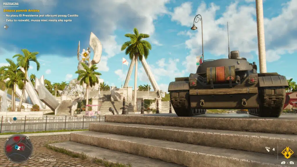 Za radiem zatęskniłem najmocniej pod koniec gry, kiedy to wyczyszczenie mapy z dział przeciwlotniczych i odblokowanie licznych kryjówek pozwoliło mi na dokonywanie desantów powietrznych, więc w większość miejsc docierałem przy pomocy wingsuita i spadochronu, które uczyniły jakąkolwiek inną formę transportu absolutnie zbędą. Gryzie się to niejako z pomysłem wyposażenia Dani w jej własny samochód (w całej grze odblokować można cztery tego typu pojazdy), który możemy w każdej chwili przywołać, o ile znajdujemy się w pobliżu głównej drogi, do której może zostać dowieziony. W teorii ma on być naszym oczkiem w głowie, który będziemy rozwijać, montując w nim tarany i dodatkowe elementy uzbrojenia, malując wedle uznania i ozdabiając tapicerkę uroczymi figurkami. W praktyce jednak kompletnie przestałem na ten element zwracać uwagę, kiedy tylko na moim wyposażeniu znalazł się wspomniany wingsuit.