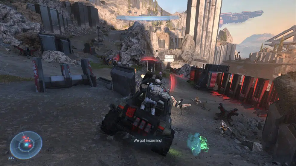 Mowa tutaj przede wszystkim o otwartym świecie, w którym osadzono akcję Halo Infinite. Pierścień Zeta możemy pomiędzy poszczególnymi misjami dowolnie zwiedzać, zbierając znajdźki, mordując wrogich kapitanów i przejmując posterunki przeciwnika. W nagrodę za wszystkie wykonane zadania otrzymujemy punkty chwały, dające nam dostęp do lepszego uzbrojenia, pojazdów i solidniej wyposażonych żołnierzy, którzy będą mogli nam towarzyszyć w naszych wojażach. Brzmi trochę jak Far Cry w kosmosie, prawda? Uspokajam więc, na szczęście Halo Infinite nim nie jest, bo cały ten otwarty świat można po prostu olać i skupić się na wykonywaniu kolejnych misji fabularnych, doświadczając Halo Infinite w sposób zbliżony do klasycznej formuły serii.