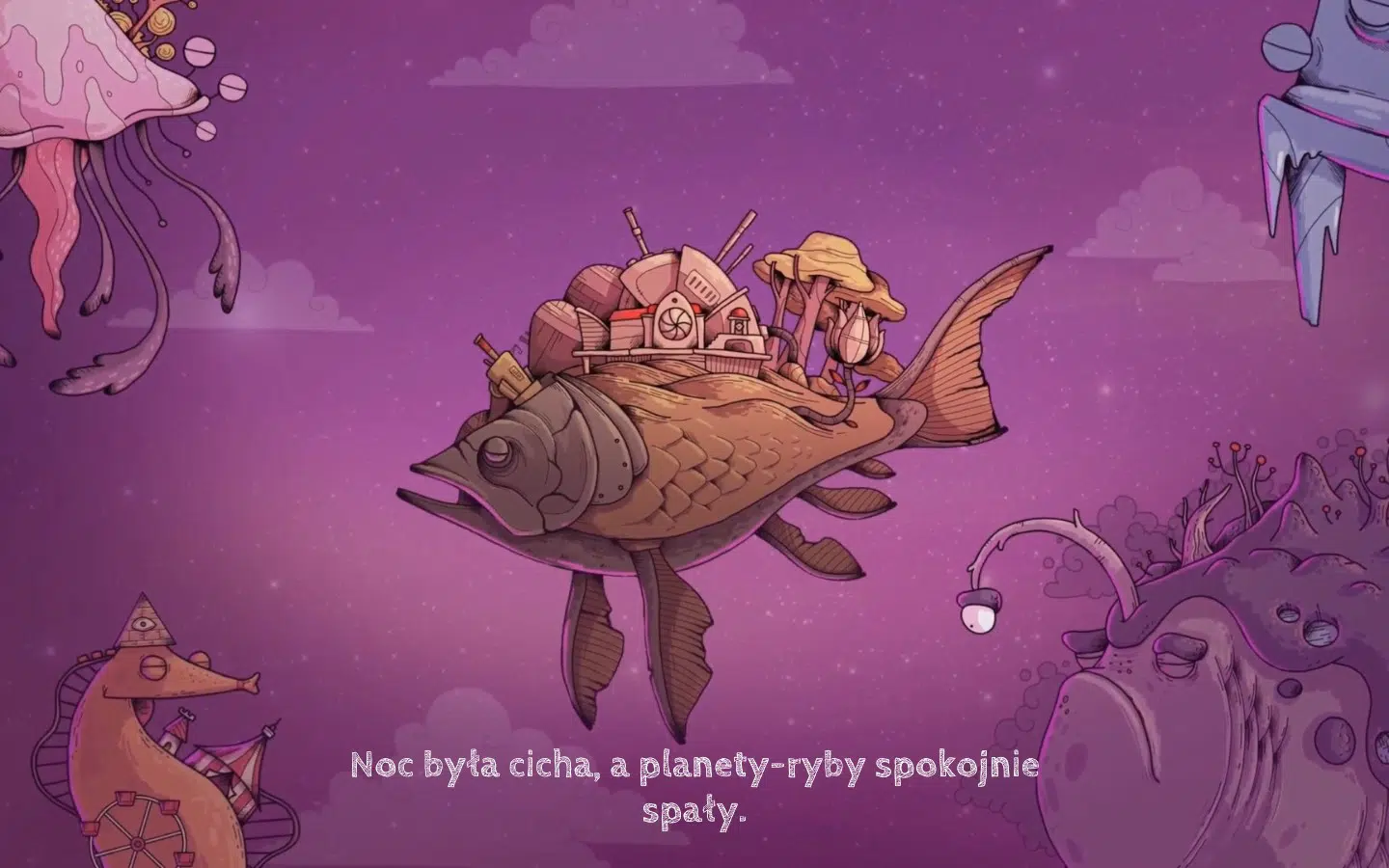 No i nie zapominajmy o samym stylu. Oprawa jest śliczna zarówno, jeśli chodzi o gotową warstwę rysunkową, jak i projekty postaci lub otoczenia. Wiem, że może to brzmieć jak list pochwalny, ale grafika TOHU jest tak ładna, że mógłbym powiesić w domu plakaty ze screenami, np. tym fragmentem z człowiekiem marchewką malującym obrazy i nikt by się nie zorientował, że to scena z jakiejś gry. Sprzyja temu ogólny klimat wylewający się z ekranu. Nietypowy, łączący nostalgię i abstrakcję. Elementy te współgrają ze sobą, sprawiając, że wszechobecna dziwność tutejszych rybo-planet to jedno z ciekawych miejsc w point & clickach.