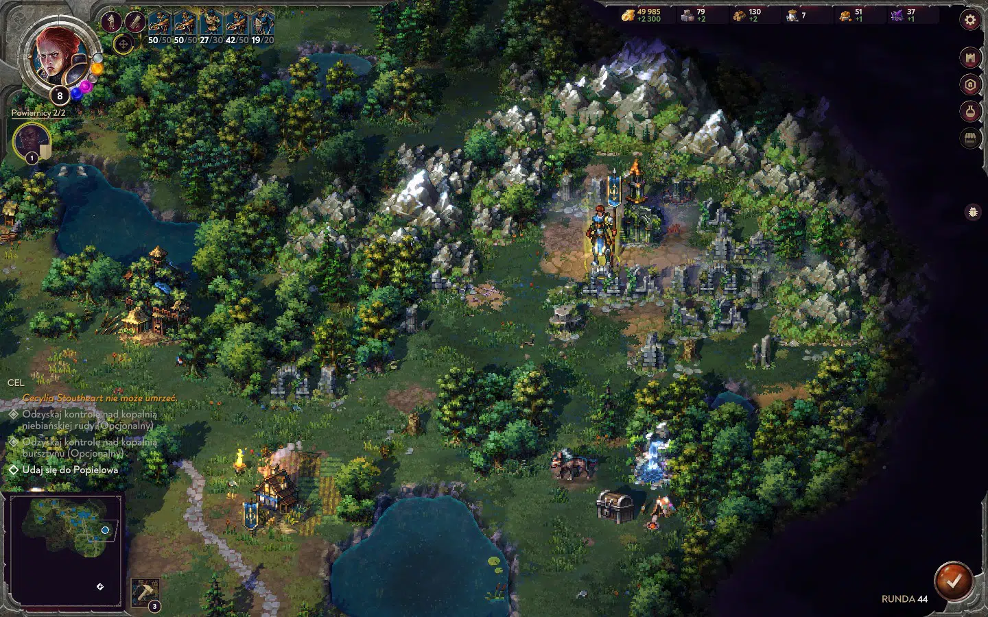 – Eksploracja: chodzenie po planszy, przejmowanie kopalni, podnoszenie walających się wszędzie surowców i złota, szukanie artefaktów, odwiedzanie miejsc czasowo wpływających na współczynniki, zaglądanie do skrzyneczek dających ekspa lub złoto, czy wreszcie bicie potworów strzegących przejść. Te wszystkie czynności dla miłośników Herosów to nie pierwszyzna i na pewno nie jednemu śni się po nocach przemierzenie plansz konikiem, by wycisnąć z nich wszystko jak cytrynkę. Co prawda w Songs of Conquest bohater chodzi na piechotę, ale poza kosmetyką ten aspekt rozgrywki nie uległ większym zmianom. Wprowadzono jedynie więcej elementów dających czasowe buffy, takich jak drogowskazy lub pomniki, ale to dalej stara i dobra eksploracja z Herosów.