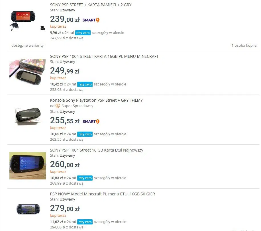 Zakup używanej PlayStation Vita to obecnie koszt około 400 złotych. W sprzedawanych używanych zestawach najczęściej znajduje się karta pamięci 8GB, co w zupełności wystarczy. Większość gier z PS One waży 400-500 MB. Stare poczciwe PlayStation Portable kupimy natomiast już od 250 złotych.
