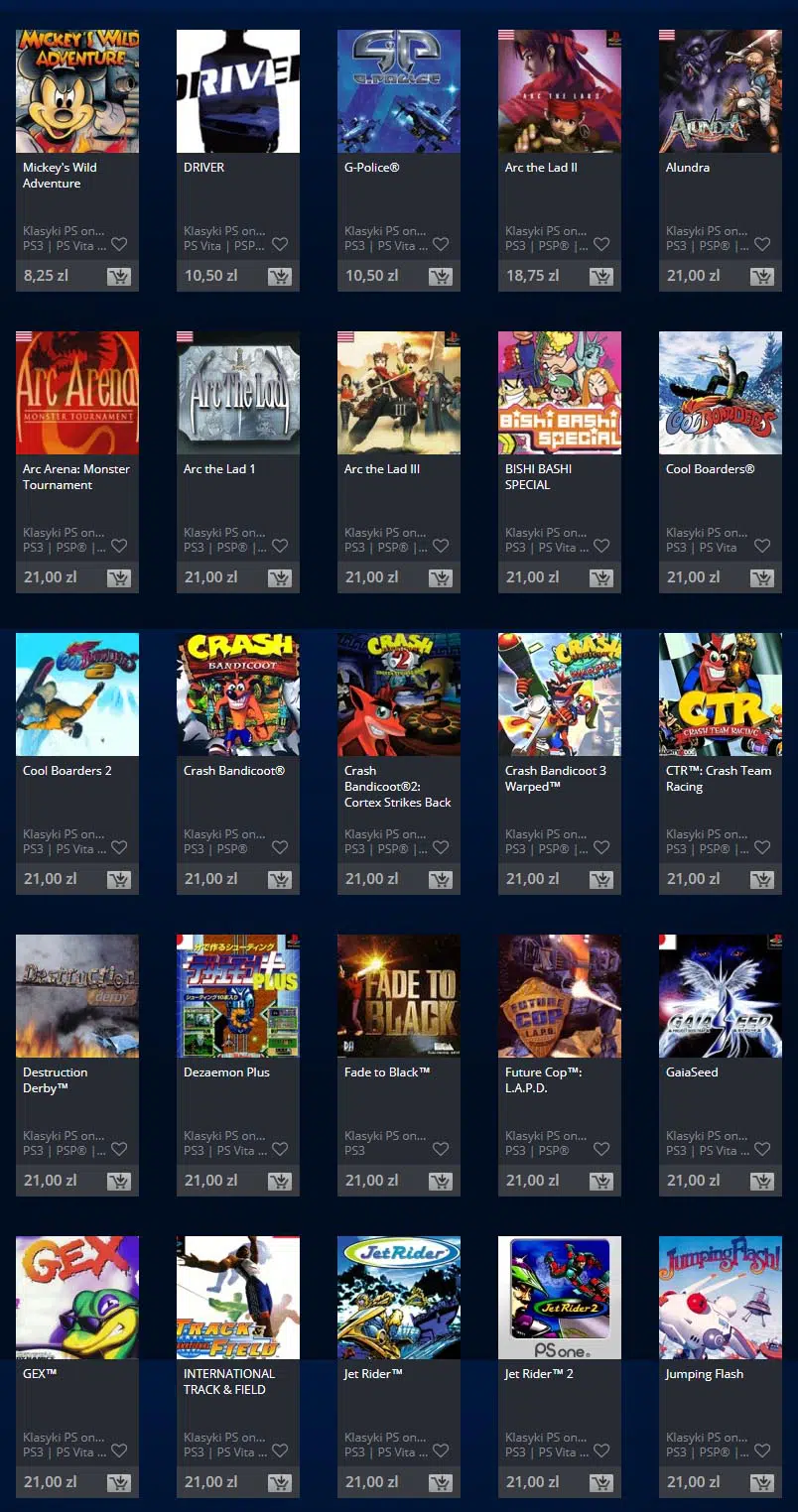 Gdybyśmy chcieli kupić wszystkie dostępne gry z powyższej listy kosztowałoby to nas 344 zł. Większość graczy jednak na pewno nie będzie zainteresowana wszystkimi produkcjami. Poza tym w PlayStation Store jest do kupienia o wiele więcej klasyków z PlayStation One. Obecnie w cyfrowym sklepie Sony znajduje się ich 74 i nie brakuje tam wielkich hitów. Wśród nich znajdziemy m.in. CTR: Crash Team Racing, MediEvil, Spyro The Dragon, Suikoden, Tomb Raider, etc. Większość gier kosztuje 21 złotych, a wszystkie dostępne produkcje przejrzycie tutaj.